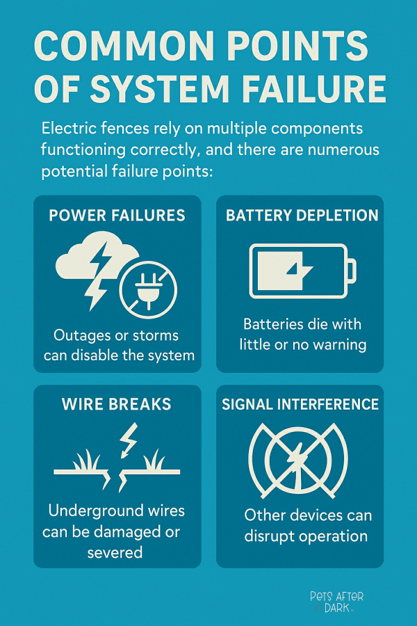 Electric fence systems depend on multiple components working perfectly, and in my experience, something is always going wrong. Power failures during storms or outages can disable the entire system. Battery depletion often occurs without any clear warning to owners—I can’t tell you how many times I’ve heard “I had no idea the battery was dead” after a dog has escaped.